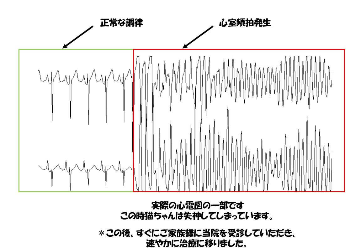 猫においてもVTは比較的稀ではあるものの、突然死のリスクを伴う重篤な不整脈として位置づけられています。